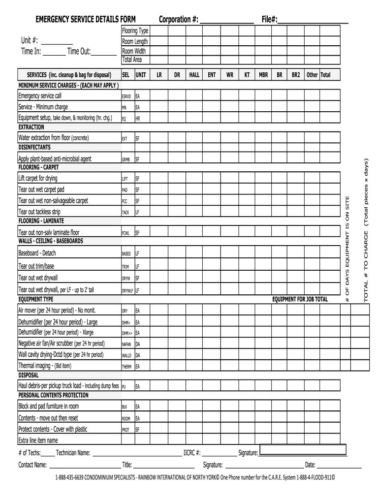 EMERGENCY SERVICE DETAILS FORM Unit #: Time In: Time Out: SERVICES (inc. cleanup & bag for disposal) Corporation #: Flooring Type Room Length Room Width Total Area 0 LR 0 DR 0 HALL 0 ENT 0 WR File#:
