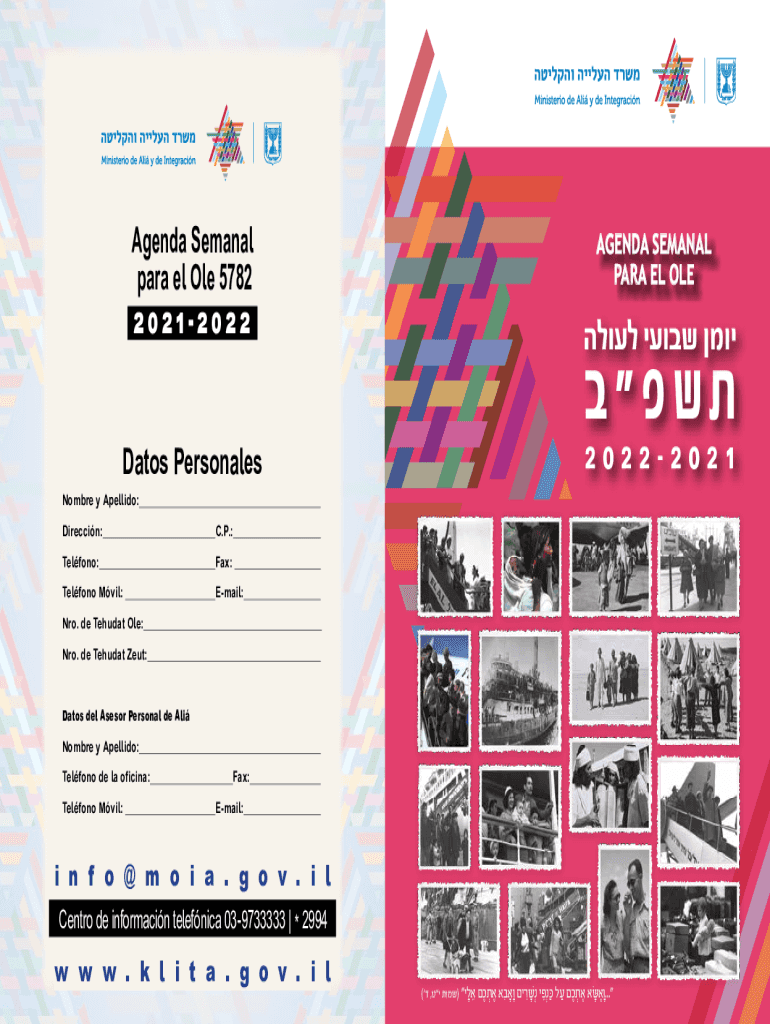 Agenda Seminal para el Ole 5782AGENDA SEMINAL PARA EL OLE20212022Datos Personages Hombre y Adelaide:Direction:C.P.:Teflon:Fax:Teflon Evil:Email:NRO. DE That Ole:NRO. DE That Zeus:Dates Del Sensor