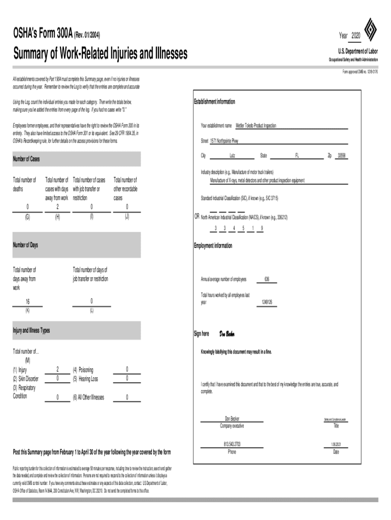 OSHA\'s Form 300A (Rev. 01×2004)YearSummary of Correlated Injuries and Illnesses2020U. S. Department of Labor Occupational Safety and Health Administration Form approved OMB no. 12180176All establishments