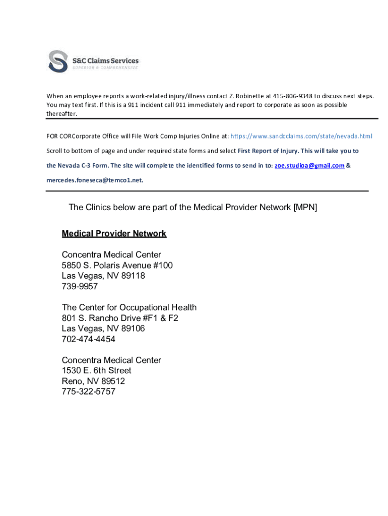 When an employee reports a work related injury×illness contact Z. Robinette at 4158069348 to discuss next steps. You may text first. If this is a 911 incident call 911 immediately and report to corporate