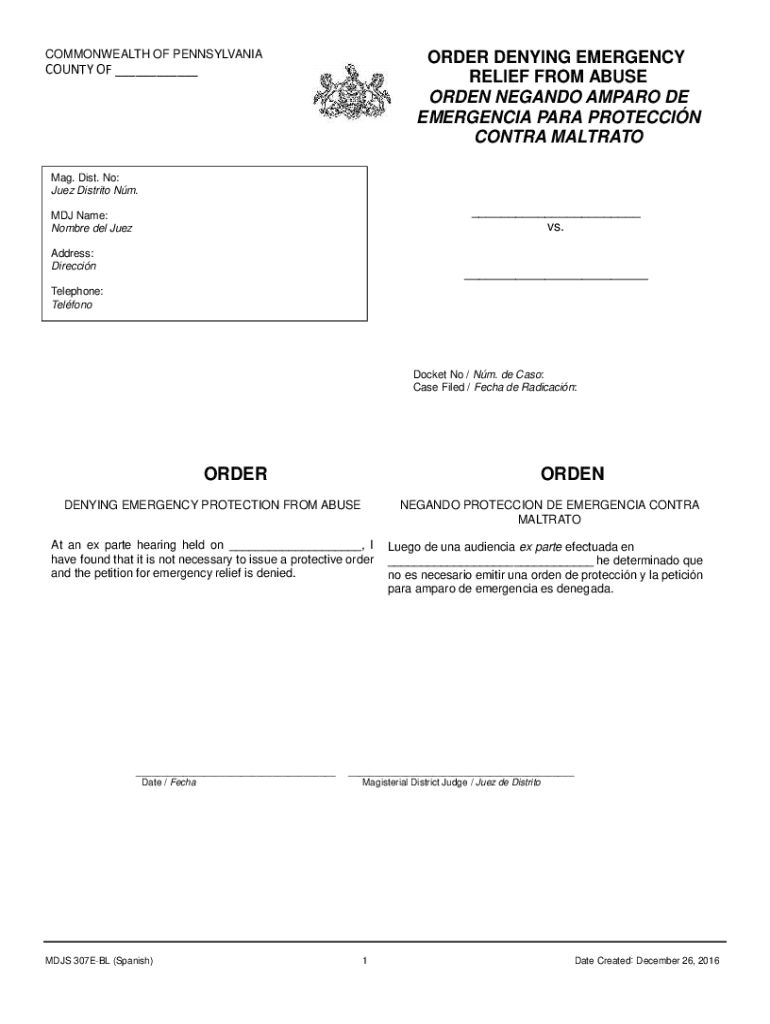 Get the free Spanish Order Denying Emergency Relief From Abuse-307E
