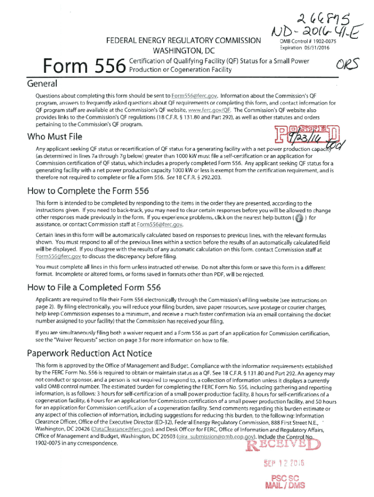 4 (plea×b R0/(FEDERAL ENERGY REGULATORY Commissioner×COMECON 1902007s Expiration 05×31/2016Q+ \'U WASHINGTON, DC Certification of Qualifying Facility (QF) Status for a Small Power Production or