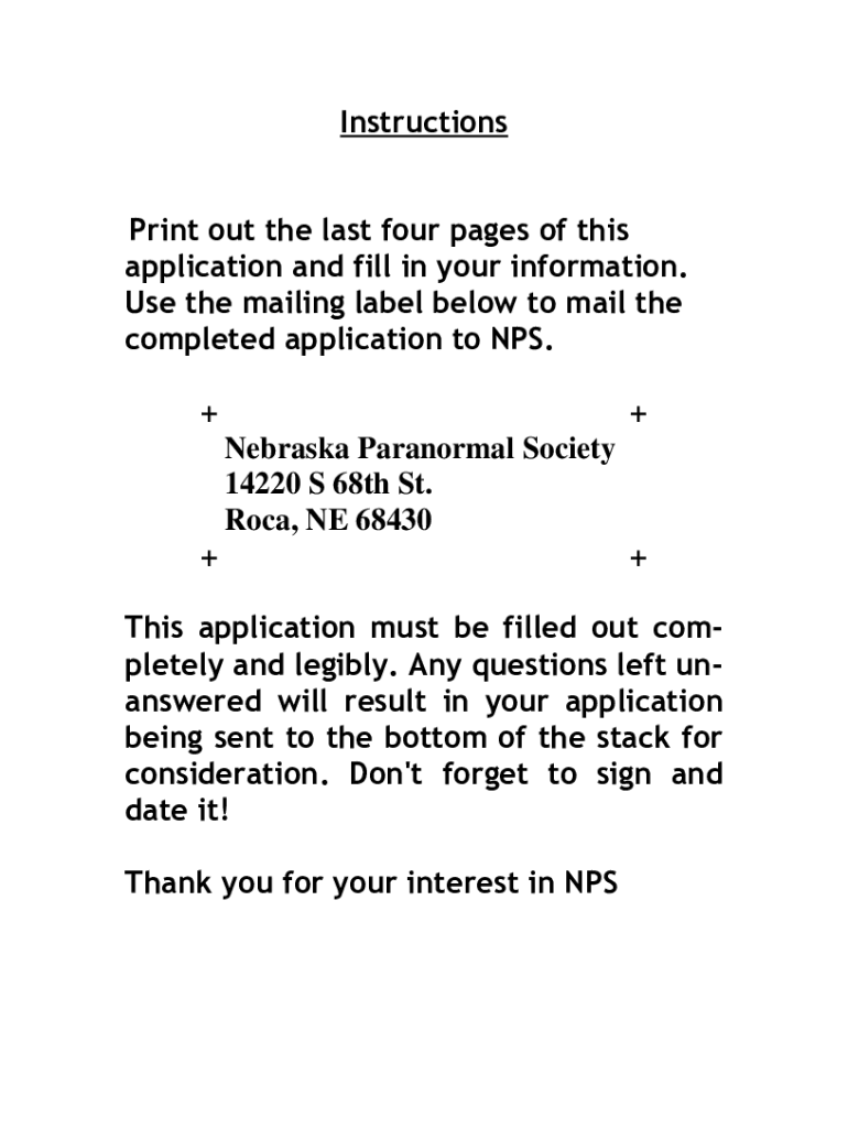 InstructionsPrint out the last four pages of this application and fill in your information. Use the mailing label below to mail the completed application to NPS. ++ Nebraska Paranormal Society 14220
