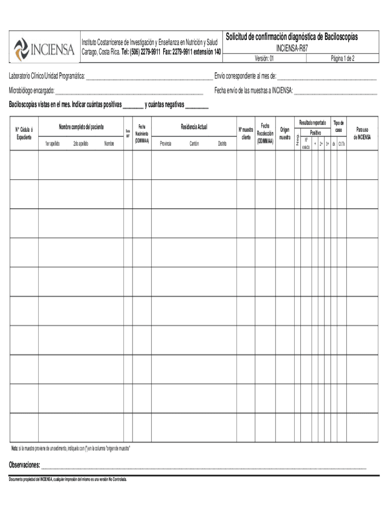 Institute Costa Ricans de Investigacin y Ensenada en Nutrition y Salad Cartage, Costa Rica. Tel: (506× 22799911 Fax: 22799911 extension 140Solicitud de confirmation diagnostic de Baciloscopas INCIENSAR87