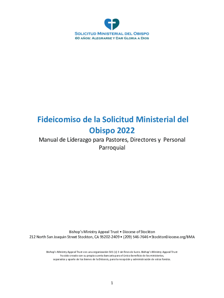 Fideicomiso de la Solicited Ministerial Del Obis 2022 Manual de Lderazgo para Pastures, Directors y Personal ParroquialBishops Ministry Appeal Trust Diocese of Stockton 212 North San Joaquin Street