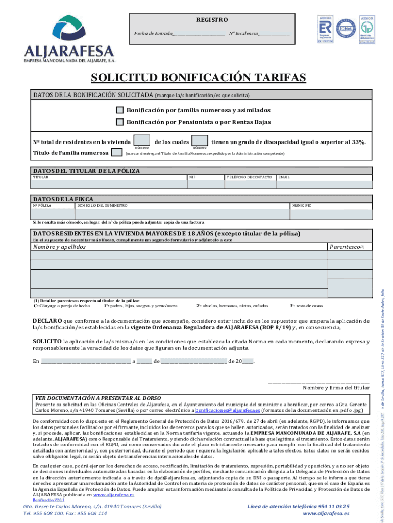 REGISTRY Tech de Estrada___ N Incidence___SOLICITED BONIFACIO TARIFFS DATES DE LA BONIFACIO SOLICIT ADA (marque la’s beautification×BS Que solicit) Bonifacio POR familiar numerous y assimilates