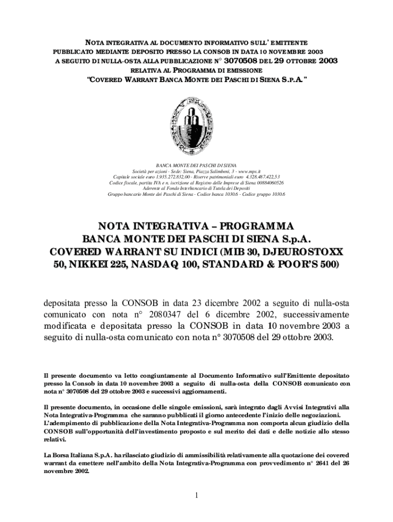 NOT INTEGRATIVE AL DOCUMENT INFORMATIVE SULLEMITTENTE PUBLICATION MEDIATE DEPOSITS PRESS OLA CONS OB IN DATA 10 NOVEMBER 2003 A SEGUNDO DI NULLAOSTA ALL PUBLICATION N 3070508 DEL 29 OCTOBER 2003 RELATIVE
