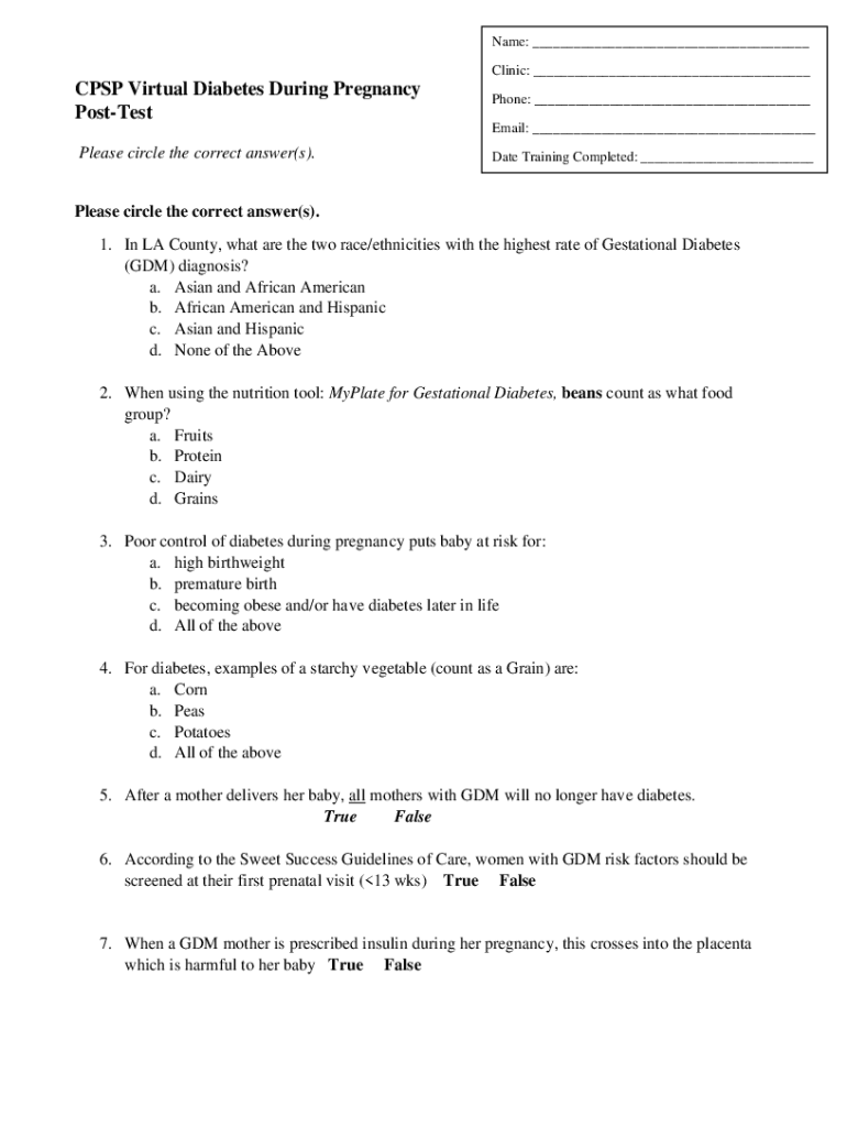 Get the free Name: Clinic: CPSP Virtual Diabetes During Pregnancy Post-Test - publichealth lacounty