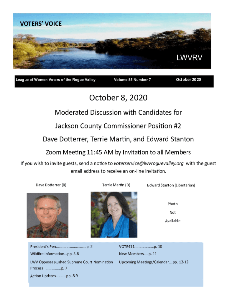 VOTERS VOICELWVRV League of Women Voters of the Rogue ValleyVolume 85 Number 7October 2020October 8, 2020 Moderated Discussion with Candidates for Jackson County Commissioner Position #2 Dave Totterer,