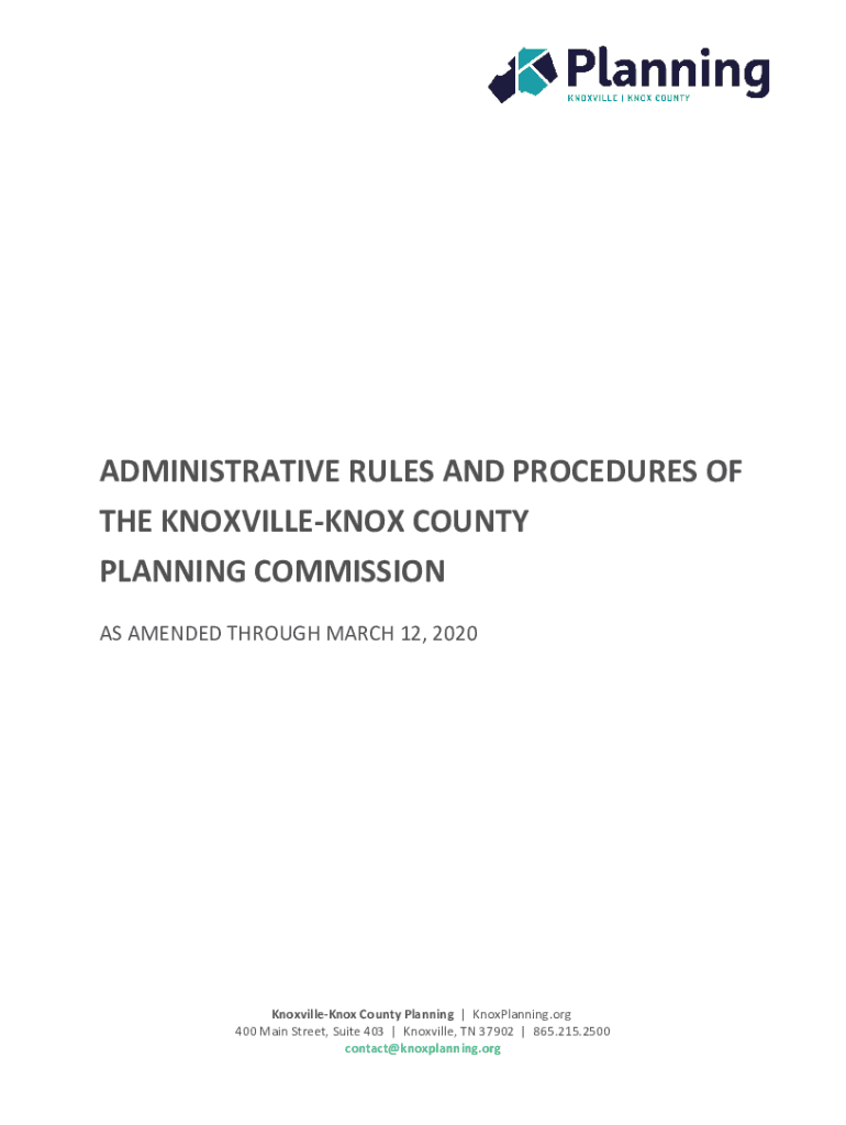 ADMINISTRATIVE RULES AND PROCEDURES OF THE KNOXVILLEKNOX COUNTY PLANNING COMMISSION AS AMENDED THROUGH MARCH 12, 2020KnoxvilleKnox County Planning | KnoxPlanning.org 400 Main Street, Suite 403 | Knoxville,