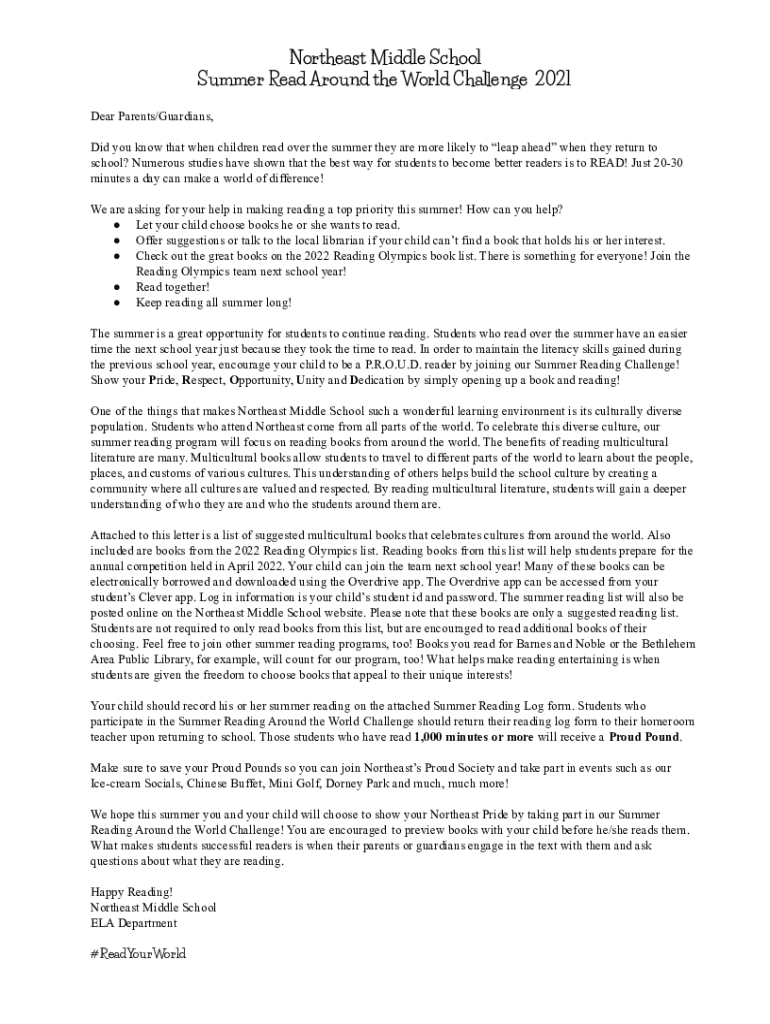 Northeast Middle School Summer Read Around the World CIA edge 2021 Dear Parents×Guardians, Did you know that when children read over the summer they are more likely to leap ahead when they return