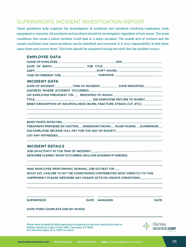 SUPERVISOR\'S INCIDENT INVESTIGATION REPORT These guidelines help organize the investigation of accidents and incidents involving employees, tools, equipment or material. All accidents and incidents