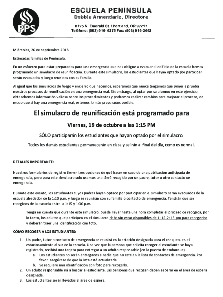 ESTELA PENINSULA Debbie Armendariz, Directora8125 N. Emerald St. / Portland, OR 97217 Teflon: (503× 916 6275 Fax: (503) 9162662Mircoles, 26 de September 2018Estimadas families DE Peninsula, En UN