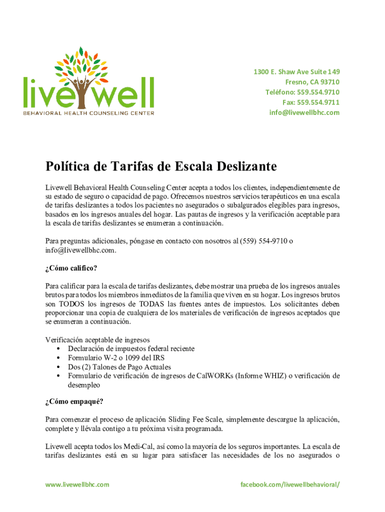 1300 E. Shaw Ave Suite 149 Fresno, CA 93710 Teflon: 559.554.9710 Fax: 559.554.9711 info×livewellbhc.composting DE Tariffs de Escala Delicate Live well Behavioral Health Counseling Center accept a