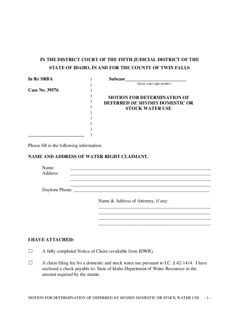 IN THE DISTRICT COURT OF THE FIFTH JUDICIAL DISTRICT OF THE STATE OF IDAHO, IN AND FOR THE COUNTY OF TWIN FALLS In Re SRBA Case No. 39576___)))))))))))Subcase___ (Insert water right number×MOTION