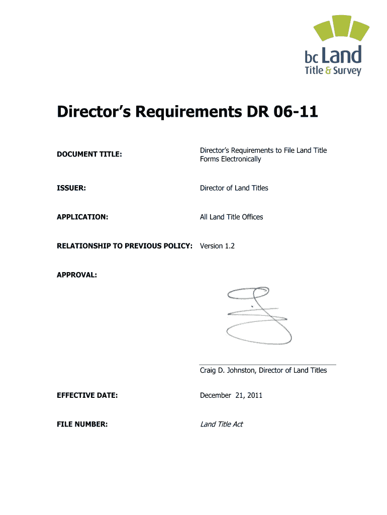 This document outlines the Director's Requirements for the electronic filing of land title forms, including guidelines for mandatory electronic submissions as stipulated in the Land Title Act. It