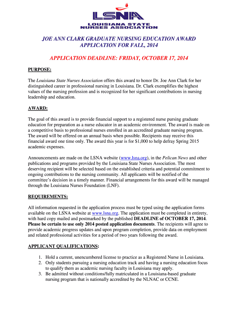 Get the free JOE ANN CLARK GRADUATE NURSING EDUCATION AWARD - lsna