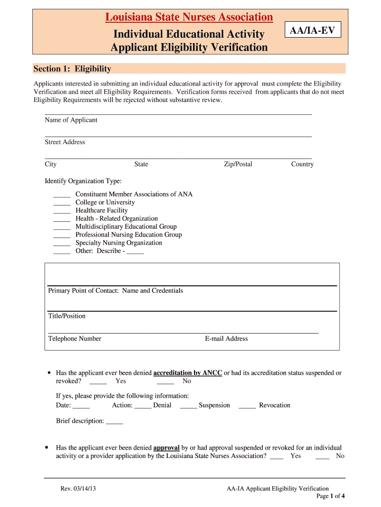 Louisiana State Nurses Association Individual Educational Activity Applicant Eligibility Verification AA/IA-EV Section 1: Eligibility Applicants interested in submitting an individual educational