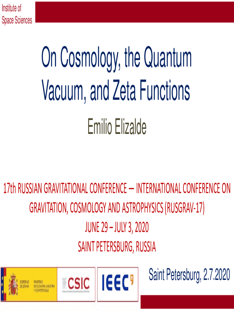 Institute of Space Sciences Cosmology, the Quantum Vacuum, and Zeta Functions Emilio Lizard 17th RUSSIAN GRAVITATIONAL CONFERENCE INTERNATIONAL CONFERENCE ON GRAVITATION, COSMOLOGY AND ASTROPHYSICS