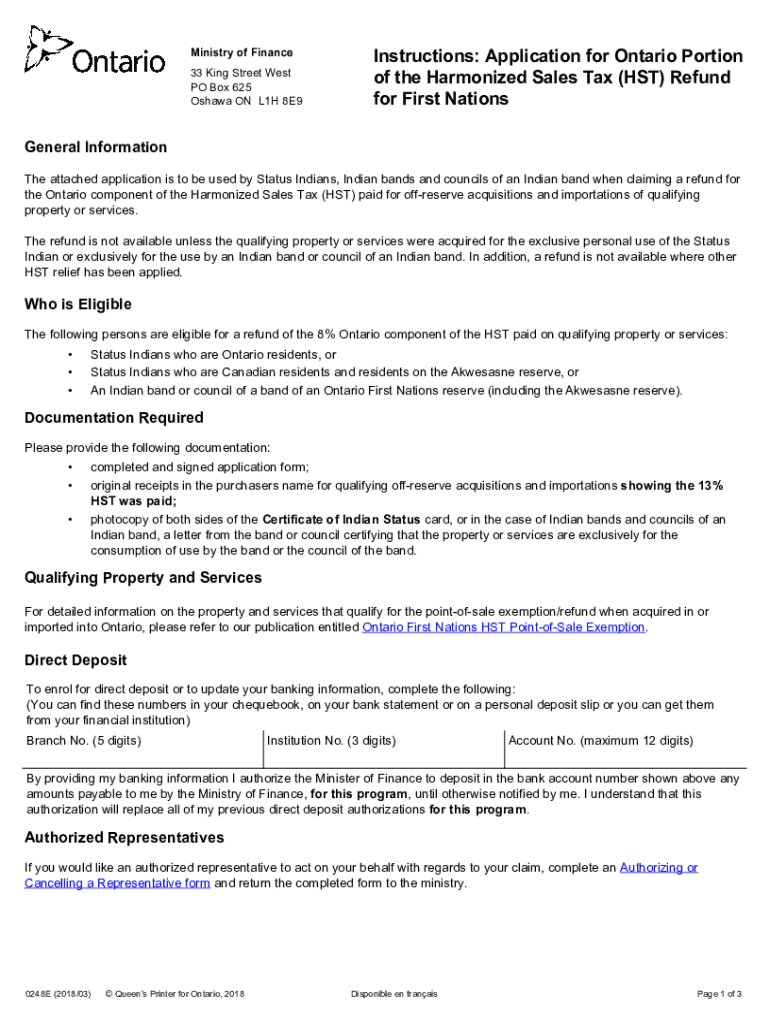 Ministry of Finance 33 King Street West PO Box 625 Oshawa ON L1H 8E9Instructions: Application for Ontario Portion of the Harmonized Sales Tax (HST) Refund for First NationsGeneral Information The