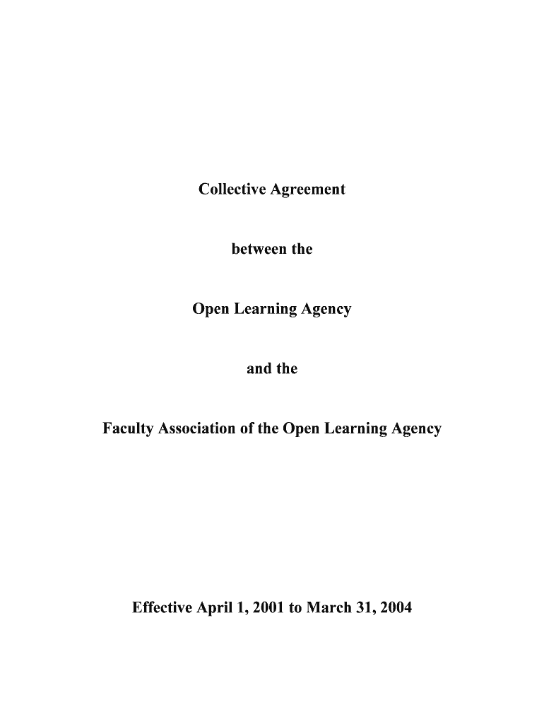 Collective Agreement between the Open Learning Agency and the Faculty Association of the Open Learning Agency Effective April 1, 2001, to March 31, 2004, TABLE OF CONTENTS ARTICLE 1 PRELIMINARY .....................................................................................................