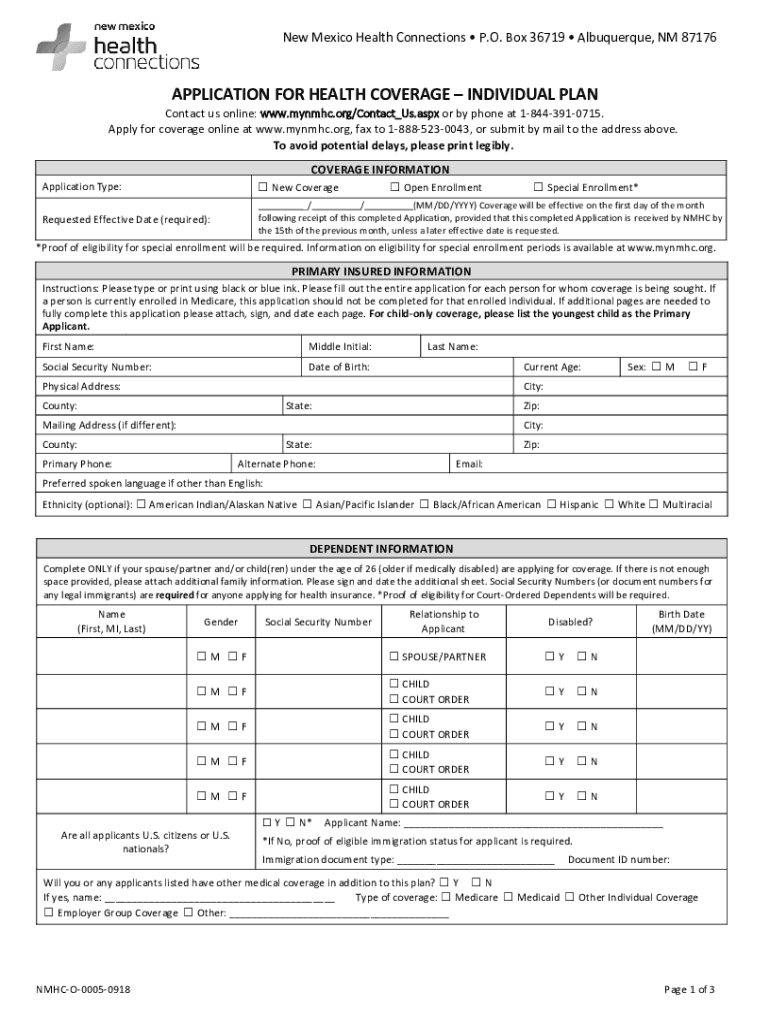 New Mexico Health Connections P.O. Box 36719 Albuquerque, NM 87176APPLICATION FOR HEALTH COVERAGE INDIVIDUAL Bancontact us online: www.mynmhc.org×Contact×Us.aspx or by phone at 18443910715. Apply