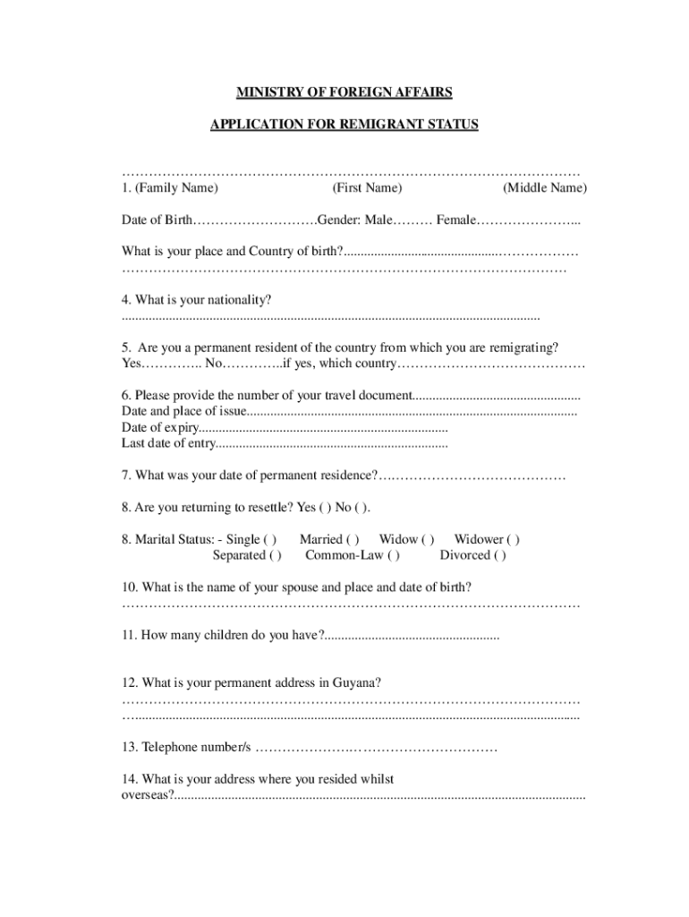 MINISTRY OF FOREIGN AFFAIRS APPLICATION FOR EMIGRANT STATUS 1. (Family Name) (First Name) (Middle Name) Date of Birth. Gender: Male Female... What is your place and Country of birth?..............................................