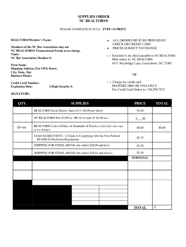 SUPPLIES ORDER NC REALTORS PLEASE COMPLETE IN FULL: TYPE OR PRINT REALTOR×Members Name:Members of the NC Bar Association may use NC REALTORS Transactional Forms at no charge. Name: NC Bar Association