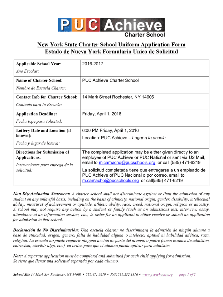 New York State Charter School Uniform Application Form Est ado de Neva York Formulation Unicode Solicited Applicable School Year:20162017Ano Escolar: Name of Charter School:PUC Achieve Charter SchoolNombre