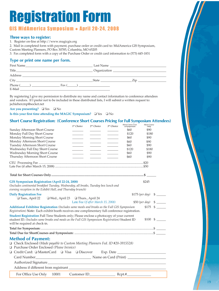 Registration Form GIS mid-America Symposium ? April 20-24, 2008 Three ways to register: 1. Register on-line at http://www.magicgis.org 2. Mail in completed form with payment, purchase order or credit