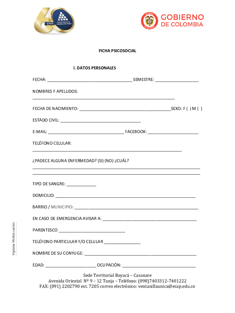 FICA PSYCHOSOCIAL. DATES PERSONAGES FEC HA: ___ SEMESTER: ___ HOMBRES Y SPELLINGS: ___ FEC HA DE NASCIMENTO: ___SEO: F () M () ESTATE CIVIL: ___ EMAIL: ___ FACEBOOK: ___ BELONG CELLULAR: ___ PAD ECE