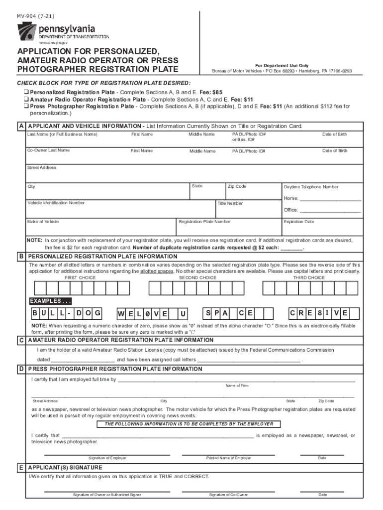 MV904 (721×www.dmv.pa.govAPPLICATION FOR PERSONALIZED, AMATEUR RADIO OPERATOR OR PRESS PHOTOGRAPHER REGISTRATION Platform Department Use Only Bureau of Motor Vehicles PO Box 68293 Harrisburg, PA