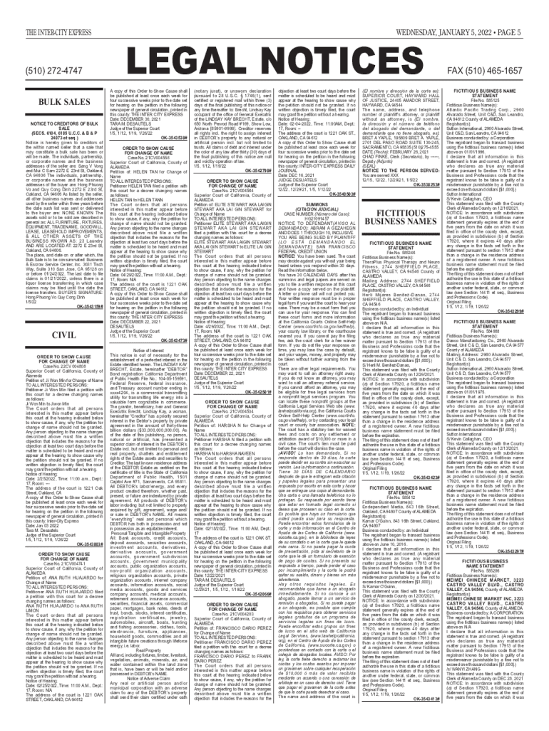 THE INTERCITY EXPRESS×510) 2724747WEDNESDAY, JANUARY 5, 2022, PAGE 5LEGAL NOTICEABLE SALES NOTICE TO CREDITORS OF BULK SALE (SECS. 6104, 6105 U.C.C. & B & P 24073 et seq.) Notice is hereby given