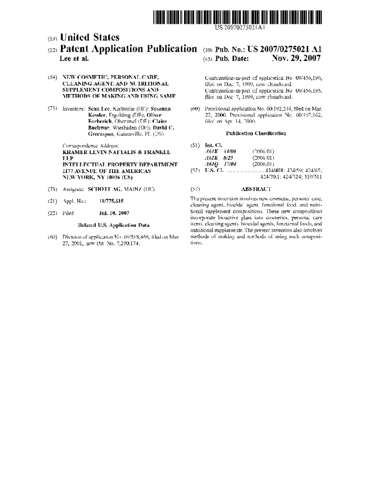 US 20070275021A1×19) United States×12) Patent Application Publication (10) Pub. No.: US 2007×0275021 A1 (43) Pub. Date:Lee et al. Continuationinpart of application No. 09×456,196,(54) NEW COSMETIC,