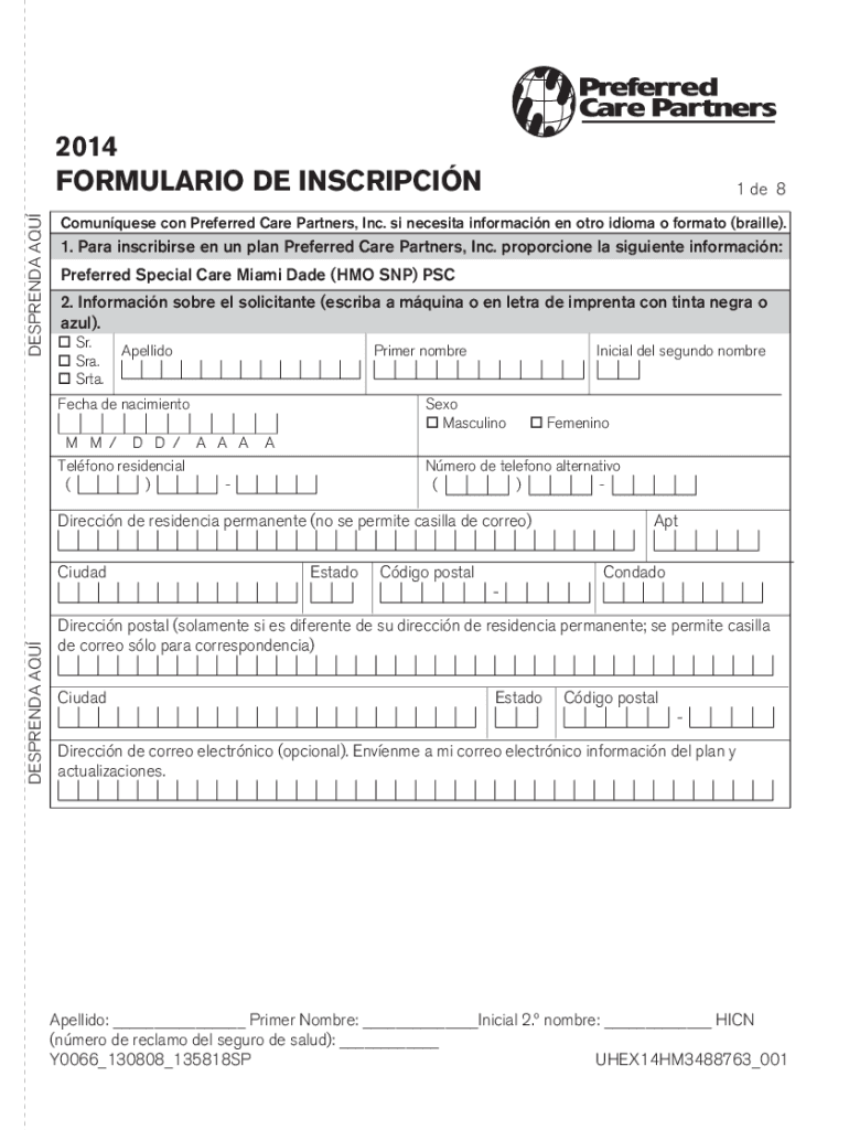 DEPENDS on AQU2014FORMULARIO DE INSCRIPCIN1 de 8Comunquese con Preferred Care Partners, Inc. is necessity information en Otto idiom o format (braille×.1. Para inscribers en UN plan Preferred Care