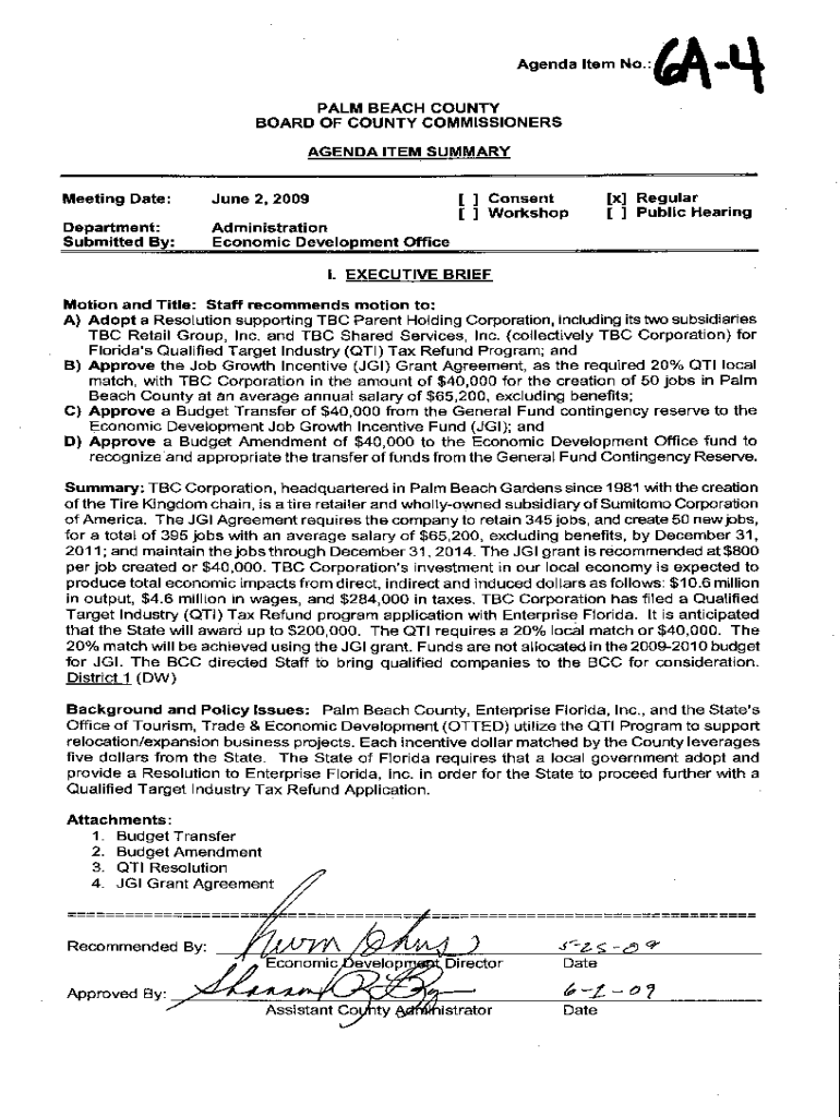 Agenda Item No.:(, ... Palm Beach County BOARD OF COUNTY COMMISSIONERS AGENDA ITEM SUMMARY[ ] Consent [ ] WorkshopMeeting Date:June 2, 2009Department: Submitted By:Administration Economic Development