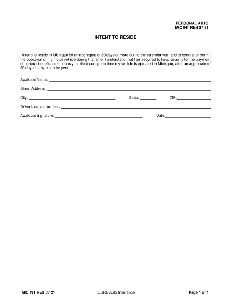PERSONAL AUTO MIC INT RES 07 21INTENT TO RESIDE intend to reside in Michigan for an aggregate of 30 days or more during the calendar year and to operate or permit the operation of my motor vehicle