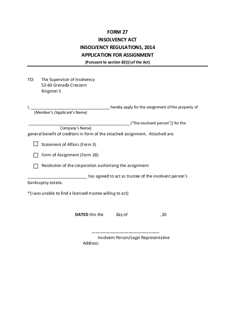 FORM 27 INSOLVENCY ACT INSOLVENCY REGULATIONS, 2014 APPLICATION FOR ASSIGNMENT (Pursuant to section 82×1) of the Act×TO:The Supervisor of Insolvency 5260 Grenada Crescent Kingston 5I, ___, hereby