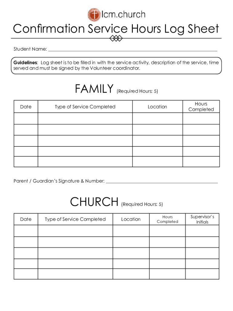 Confirmation Service Hours Log Sheet Student Name: ___ Guidelines: Log sheet is to be filled in with the service activity, description of the service, time served and must be signed by the Volunteer