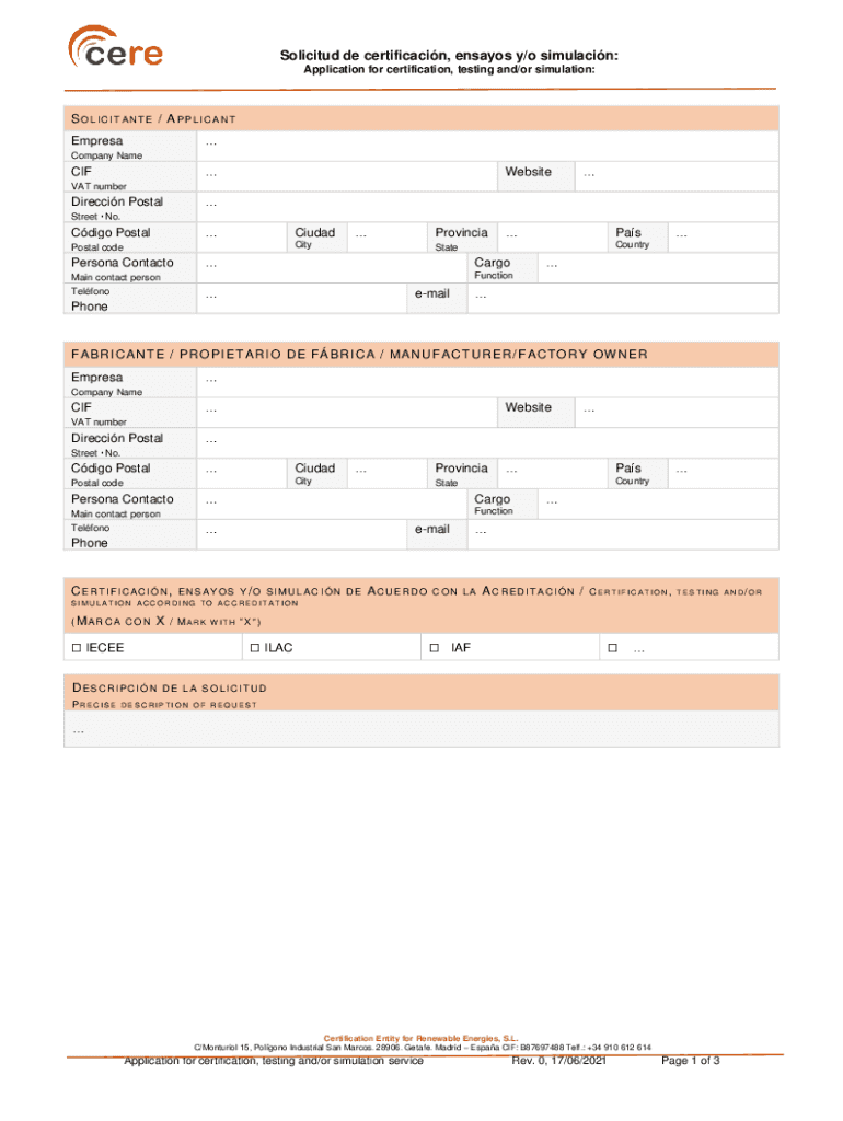 Solicited DE certification, essays y×o simulation: Application for certification, testing and×or simulation:SOLICITING / APPLICANT Empress Company NameCIFWebsiteVAT numberDireccin Postal Street