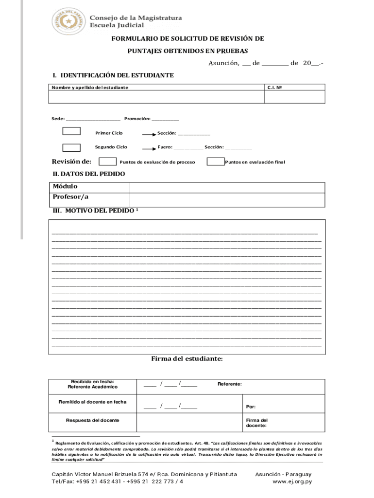 FORMULA RIO DE SOLICITED DE REVISION DE PENTANES OBTENIDOS EN RUMBAS Asunción, ___ DE ___ DE 20___. I. IDENTIFICATION DEL ESTUDIANTE Hombre y Adelaide Del estudianteC. I. Used: ___ Promotion: ___