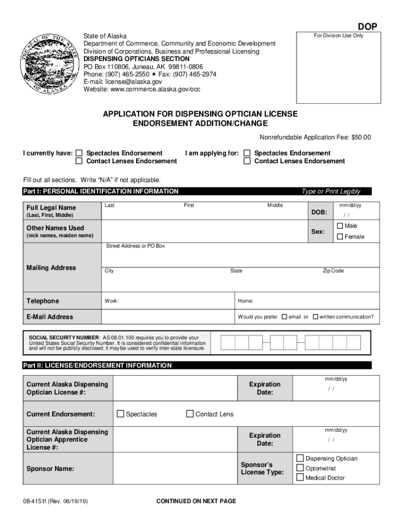 DOP For Division Use Onstage of Alaska Department of Commerce, Community and Economic Development Division of Corporations, Business and Professional Licensing DISPENSING OPTICIANS SECTION PO Box