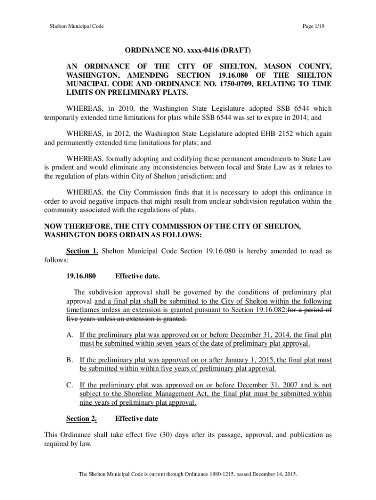 Shelton Municipal Code Page 1×19ORDINANCE NO. xxxx0416 (DRAFT) AN ORDINANCE OF THE CITY OF SHELTON, MASON COUNTY, WASHINGTON, AMENDING SECTION 19.16.080 OF THE SHELTON MUNICIPAL CODE AND ORDINANCE