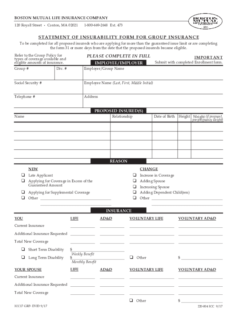 BOSTON MUTUAL LIFE INSURANCE COMPANY 120 Royal Street Canton, MA 0202118006692668 Ext. 473STATEMENT OF INSURABILITY FORM FOR GROUP INSURANCE To be completed for all proposed insureds who are applying