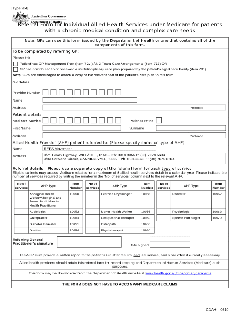 The Referral for Individual Allied Health ... - Thrive Dietetics is a writable document you can get completed and signed for specific purposes. In that case, it is furnished to the exact addressee in order to provide specific details and data. The completion and signing may be done in hard copy or via a suitable solution like PDFfiller. These services help to send in any PDF or Word file without printing out. It also allows you to customize its appearance for your needs and put a valid e-signature. Once finished, you send the Referral for Individual Allied Health ... - Thrive Dietetics to the respective recipient or several recipients by email and even fax. PDFfiller has got a feature and options that make your blank printable. It provides various settings for printing out appearance. It does no matter how you'll deliver a form after filling it out - in hard copy or by email - it will always look well-designed and firm. In order not to create a new editable template from the beginning over and over, turn the original document as a template. Later, you will have a customizable sample.