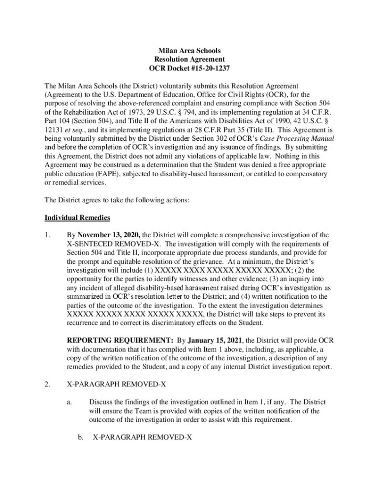 Milan Area Schools Resolution Agreement OCR Docket #15201237 The Milan Area Schools (the District) voluntarily submits this Resolution Agreement (Agreement) to the U.S. Department of Education, Office