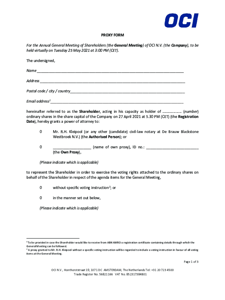 PROXY FORM For the Annual General Meeting of Shareholders (the General Meeting) of OCI N.V. (the Company×, to be held virtually on Tuesday 25 May 2021 at 3:00 PM (CET×. The undersigned, Name ___