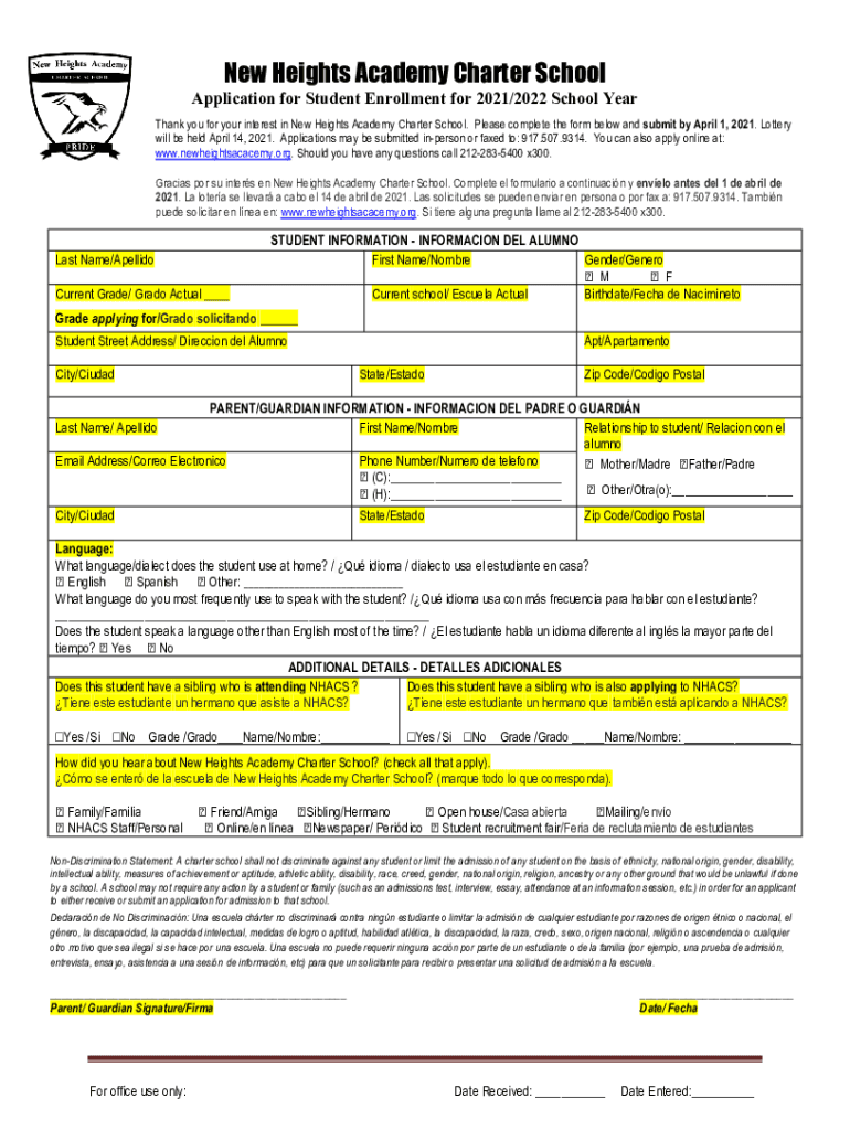 New Heights Academy Charter School Application for Student Enrollment for 2021×2022 School Year Thank you for your interest in New Heights Academy Charter School. Please complete the form below and