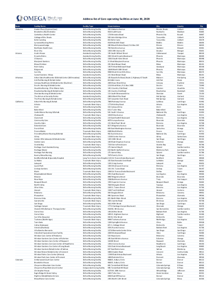 AddresslistofCoreoperatingfacilitiesatJune30,2020 State AlabamaArizonaArkansasCaliforniaColoradoFacilityName AvalonPlace×CypressCove) Brookshire×Westside) CanterburyHealthCenter CottageoftheShoals