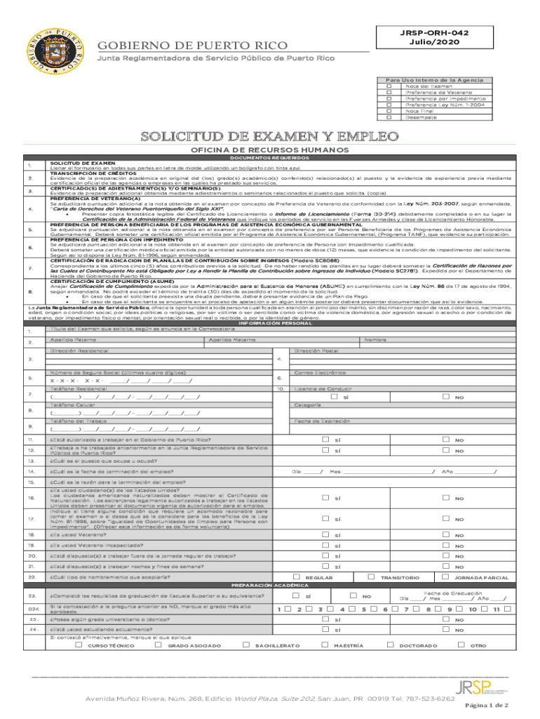 JRSPORH042 Julio×2020GOBIERNO DE PUERTO RICO Junta Reglamentadora de Servicio Public de Puerto Rico Para USO Intern ode la Agency Not Del Examen Preference de Veterano Preference POR Impediment Preference